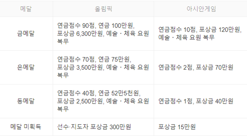 은메달: 연금점수: 70점, 연금: 매월 75만원, 포상금: 3,500만원, 예술체육요원 복무(남성)