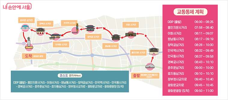 ○ 주요코스 : DDP→ 흥인지문→ 율곡터널→ 경복궁사거리→ 청와대로→ 청와대사랑채→ 광화문광장, 약6KM
