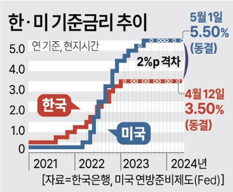 연준은 지난 2022년 3월부터 지난해 7월까지 금리 인상을 계속하며 22년 만에 가장 높은 수준까지 올렸습니다. 현재 한국의 기준금리는 3.50%로, 이번 조처에 따라 양국 금리 차이는 종전 2.00%포인트에서 1.50%포인트로 줄었습니다.