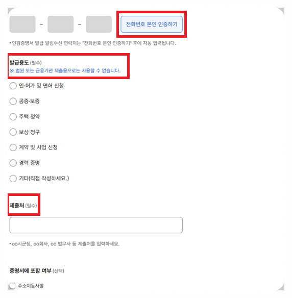 - 신청서 작성: 발급 용도와 제출처를 입력한 뒤, 전자서명 및 휴대전화 인증을 진행합니다.