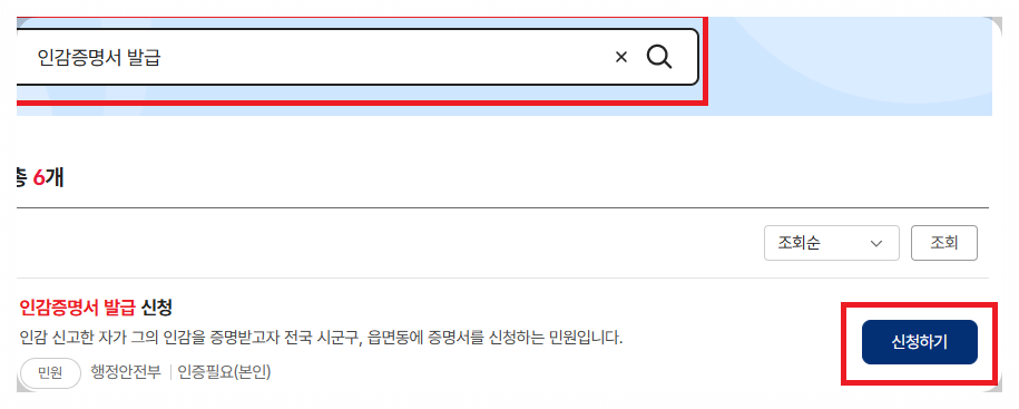 - 인감증명서 신청: 검색 창에 '인감증명서'를 입력하고, 신청 버튼을 클릭합니다.