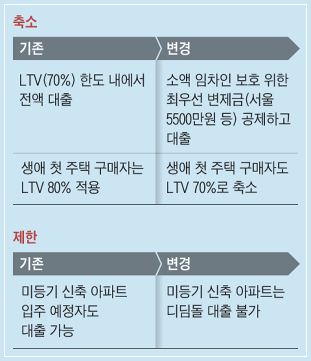 그동안 생애 첫 주택을 구입하는 경우 디딤돌 대출은 담보인정비율(LTV)을 80%까지 인정했지만, 앞으로는 일반 대출자와 마찬가지로 70%로 줄어듭니다. 또한, 기존에는 주택금융공사 보증에 가입하면 소액 임차인을 위한 최우선변제금(서울 5,500만 원)도 포함해 대출해줬지만, 앞으로는 대출금에서 이를 제외합니다. 아직 등기가 되지 않은 신축 아파트를 대상으로 한 ‘후취 담보대출’은 아예 중단하기로 했습니다.