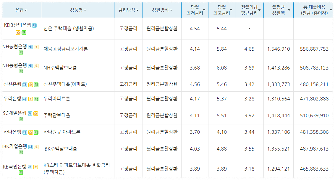 위 대출 테이블은 고정 금리, 원리금 분할 상환, 30년 대출 조건으로 검색한 결과입니다. 현재 기준으로는 총 대출 비용이 KB국민은행(465,883,633원)이 가장 적네요. NH농협은행과도 차이가 큽니다. KB국민은행의 월평균 상환액은 1,294,121 입니다.