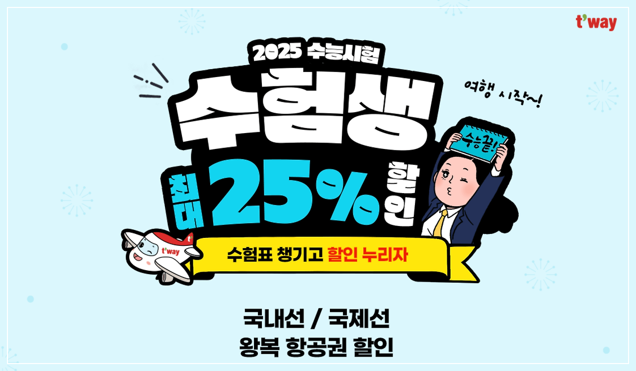 2025 수능을 마친 수험생 여러분, 그 동안 고생 많으셨습니다! 11월 14일 목요일 수능일에는 한파가 없다고 하니 다행이죠? 이제는 그동안의 노고를 보상받을 때입니다. 여기 2025 수능 수험생들을 위한 최고의 할인 혜택을 소개합니다. 기간제한과 선착순 마감이 있으니 서둘러 주세요!