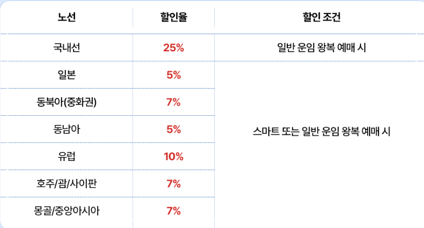- 혜택: 국내선 25%, 국제선 최대 10% 할인 (국내선 일반 운임 왕복, 국제선 스마트 또는 일반 운임 왕복 시)