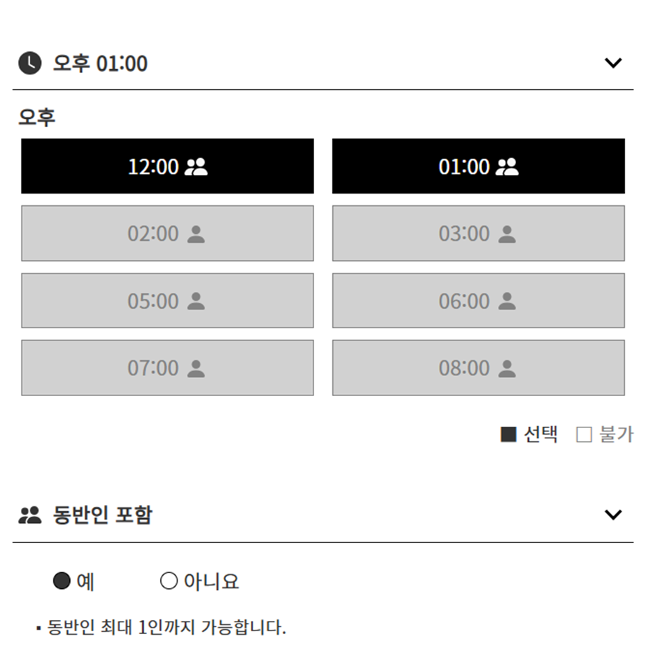 - 예약 날짜와 시간 선택: 최대 1인 동반 가능