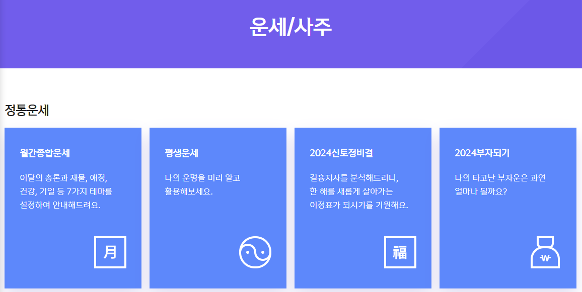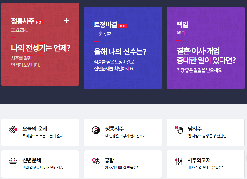 - 오랜 역사를 가진 무료 사주 사이트로, 다양한 운세 서비스를 완전히 무료로 제공하는 것이 특징입니다.