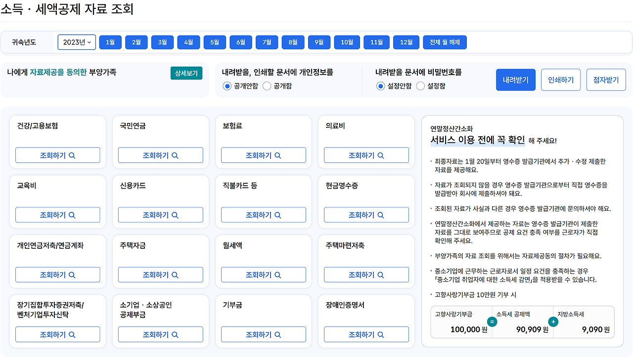 - 공제 자료 확인: '공제 자료 조회(간소화 자료)' 버튼을 클릭하여 필요한 자료를 확인합니다.