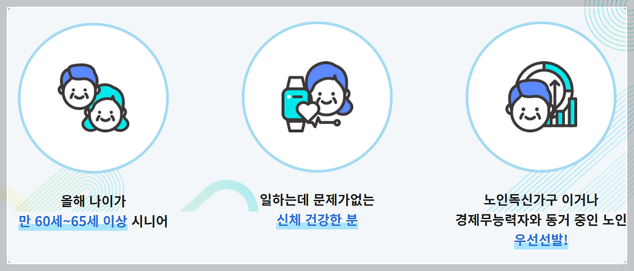 - 연령: 기본적으로 만 65세 이상, 일부 사업의 경우 만 60세 이상도 참여 가능