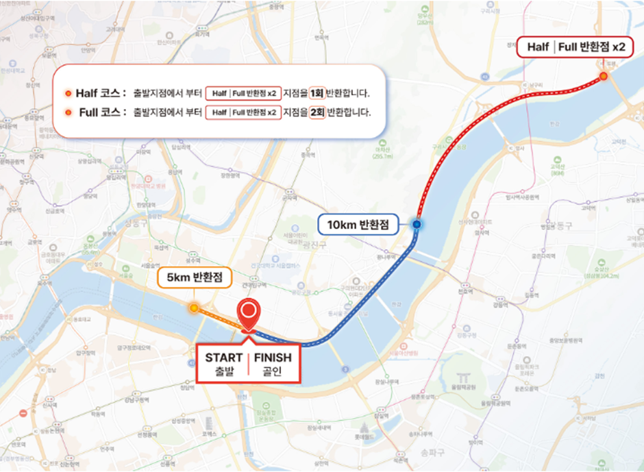 ▶ 풀코스 반환점 통과 제한 시간은 2시간 45분이며, 완주 제한 시간은 5시간입니다.