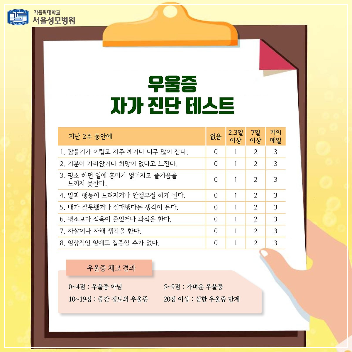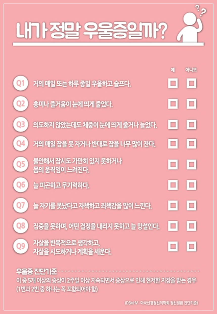 우울증 자가진단법에 대해 알려드리겠습니다. 우울증은 가볍게 넘길 문제가 아닙니다. 정확히 자기 상태를 파악하고 극복하는 게 우선 입니다. 이에 스스로 진단하고 관리하는 방법에 대해 자세히 설명드리겠습니다. 자가진단 말고 더 많은 정보가 필요하다면 아래의 링크를 참고해 보세요.