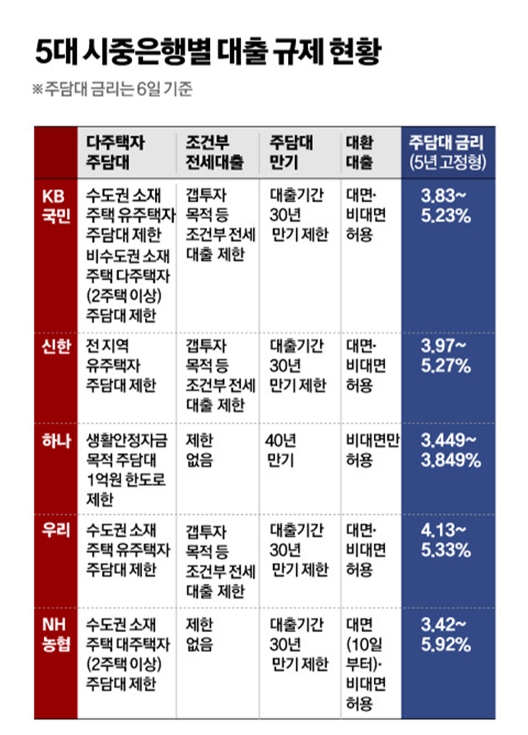 5대 시중은행별 대출규제 내용