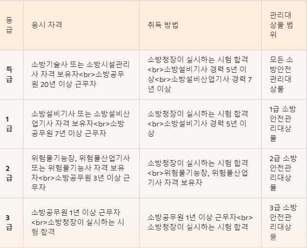 소방안전관리자 등급 (특급, 1급, 2급, 3급)