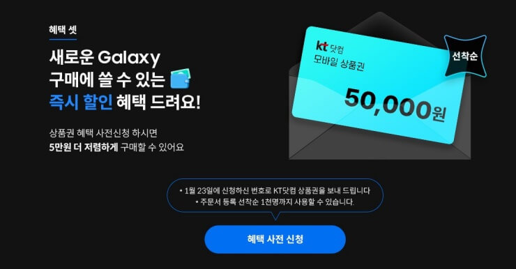 - 삼성 케어플러스 1년 무상 제공 또는 갤럭시 버즈3 특가 구매 선택