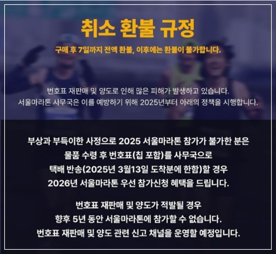 - 번호표 반송: 3월 13일까지 번호표를 택배로 반송할 경우, 2026년 서울마라톤 우선 참가 신청 가능