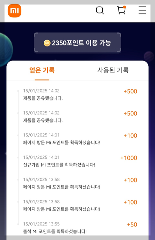 - 출석체크, 신규가입, 페이지 방문 후 15초 이상 조회 3번, 제품 공유 2회 등의 미션 수행.