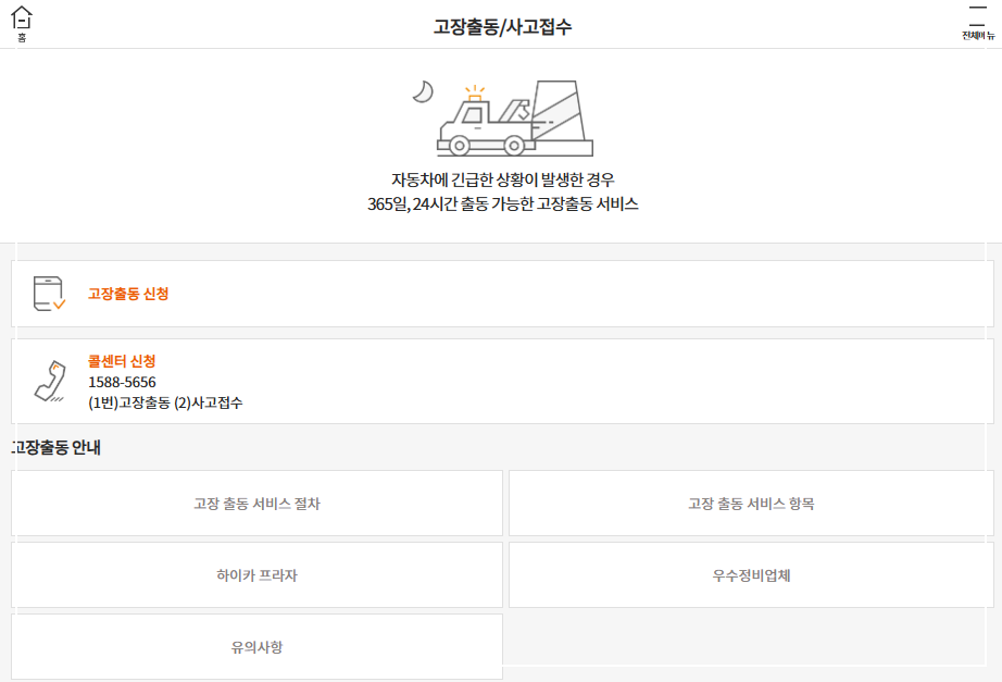 - 콜센터 연락 : 현대해상 고객센터(1588-5656)로 전화하거나, 스마트폰 앱을 통해 서비스 요청을 합니다.