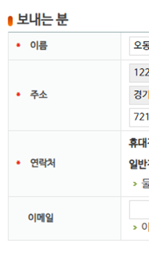 결제를 완료한 후 확인해보니 보내는 사람 주소가 변경 전 이전 주소로 자동 입력되어 있는 경우가 있습니다. 이는 회원정보에 저장된 기본 주소가 자동으로 입력되기 때문입니다.