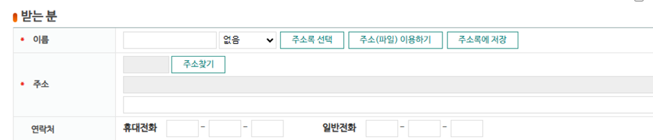 미리 엑셀로 작성한 수신인 주소 파일을 업로드하여 한 번에 여러 주소를 등록할 수 있습니다. 이 기능이 대량 발송의 핵심입니다.