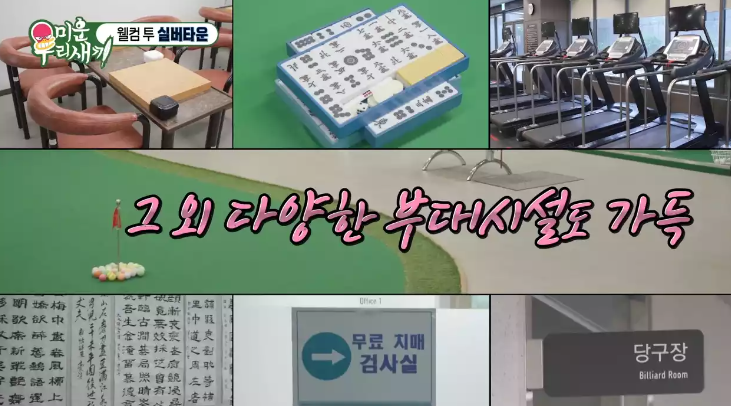 별도 시설: 바둑장기실, 동호회실, 종교실, 영화감상실, 노래연습실, 북 카페, 여성 공방, 어린이 놀이방, 서예실, 갤러리 등.