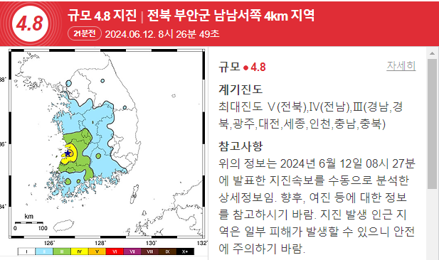 위의 정보는 2024년 6월 12일 08시 27분에 발표한 지진속보를 수동으로 분석한 상세정보임. 향후, 여진 등에 대한 정보를 참고하시기 바람. 지진 발생 인근 지역은 일부 피해가 발생할 수 있으니 안전에 주의하기 바람.