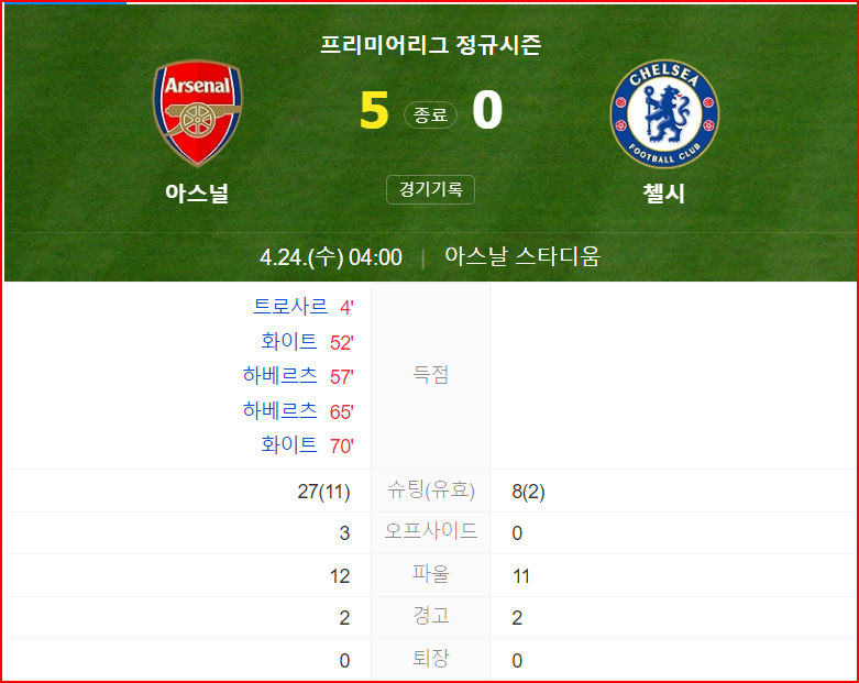구글에서 아스널 대 첼시 검색량이 5만으로 검색어 1위에 올랐습니다. 이는 아스널이 첼시를 상대로 5-0의 압도적인 승리를 거두며 놀라운 경기 결과에 대한 뜨거운 반응이 아닐까 합니다. 이 정도로 EPL 인기가 높나요?.
