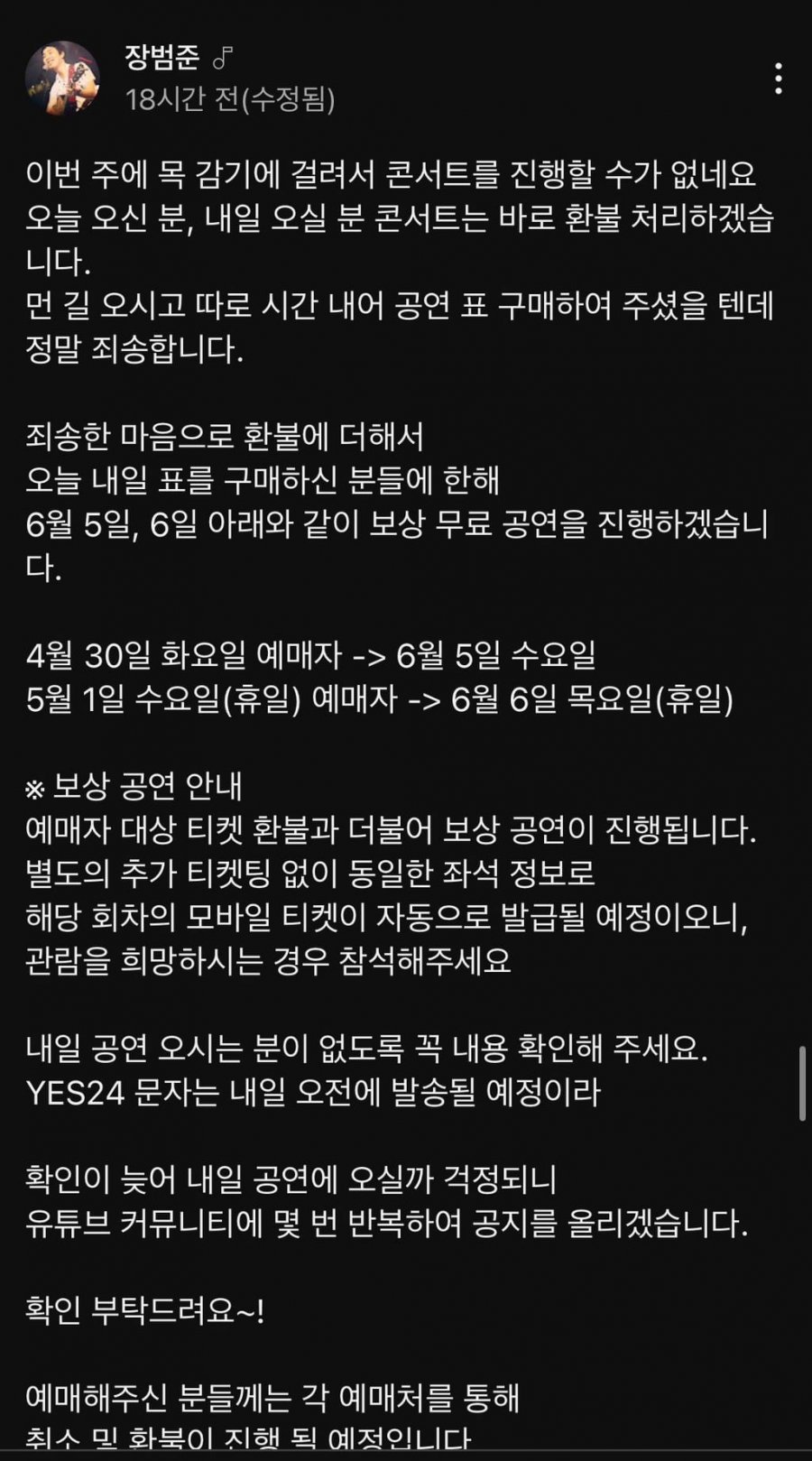 추후 건강이 회복되면, 보상 공연을 개최할 계획이라고 합니다.
